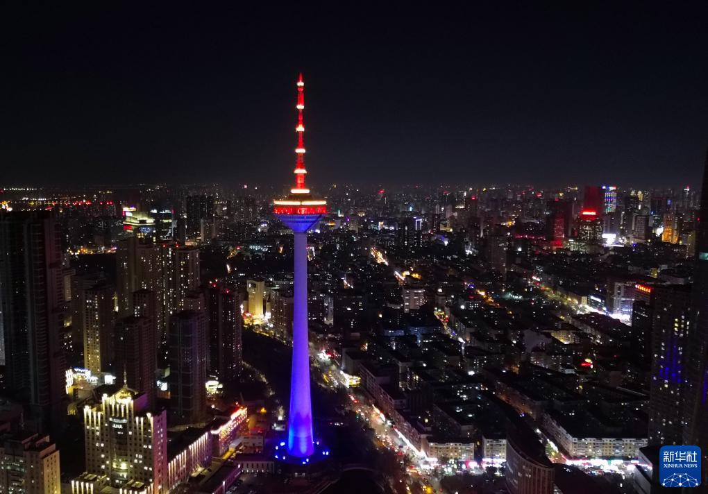 11月20日,沈阳市辽宁广播电视塔为世界儿童日亮灯(无人机照片)。新华社