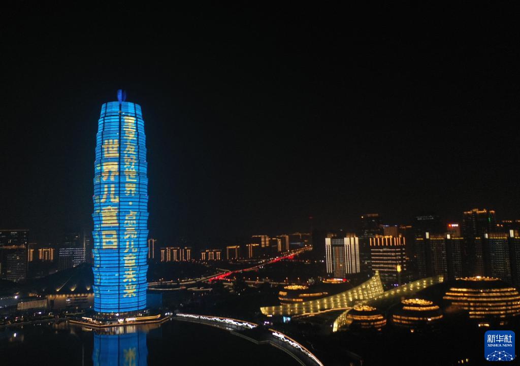 11月20日,郑州市千玺广场主楼为世界儿童日亮灯(无人机照片)。新华社
