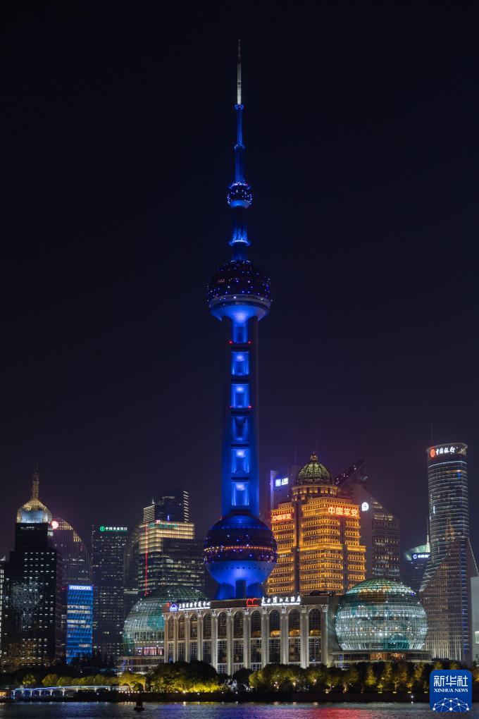 11月20日,上海陆家嘴地标建筑为世界儿童日亮灯。新华社