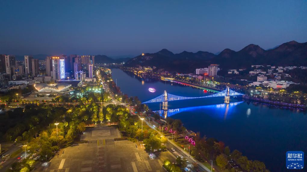 11月20日是世界儿童日,中国多地在联合国儿童基金会的支持下,用象征儿童友好的蓝色灯光点亮了当地标志性建筑或社区,以表达人们对实现儿童权利的承诺。今年世界儿童日的主题是“童享友好世界,点亮儿童未来”。图为11月20日,安徽省黄山市屯溪区新安江观光索桥为世界儿童日亮灯(无人机照片)。新华社