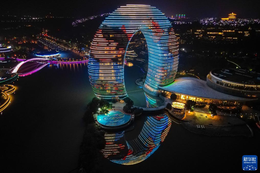11月20日,在浙江省湖州市南太湖新区月亮湾,当地地标建筑为世界儿童日亮灯(无人机照片)。新华社