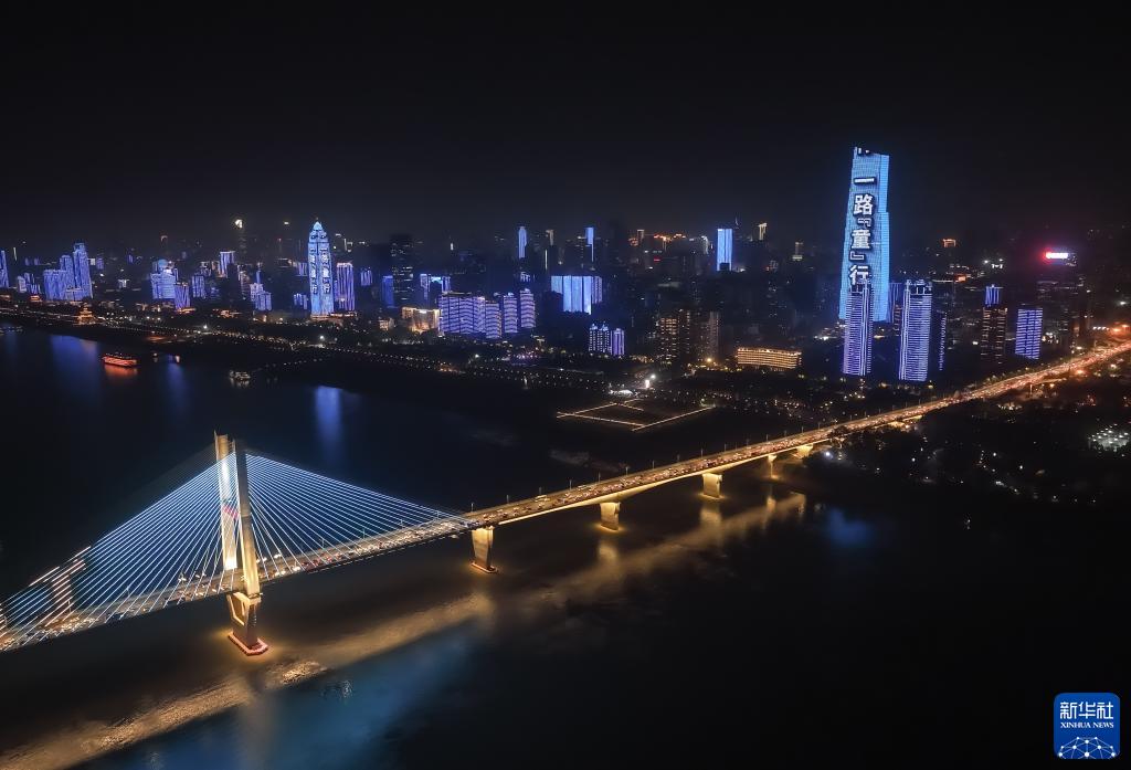 11月20日,武汉长江二桥、长江两岸建筑为世界儿童日亮灯(无人机照片)。新华社