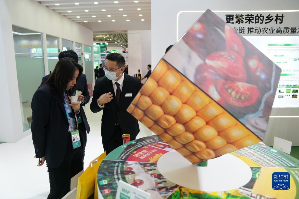 11月28日,首届中国国际供应链促进博览会在北京开幕。为期5天的链博会以“链接世界 共创未来”为主题,参会的中外企业和机构将集中展示各链条上中下游关键环节的新技术、新产品、新服务。图为11月28日,参展商与参会嘉宾在绿色农业链展区交流。新华社