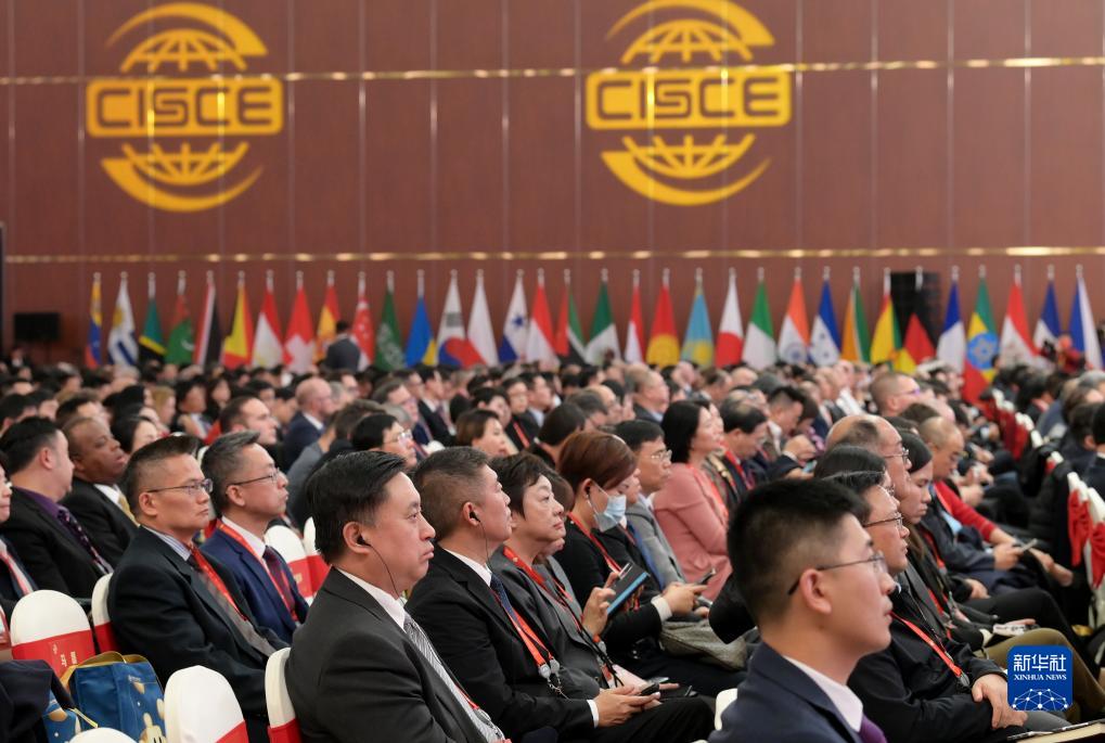 11月28日,中外与会嘉宾在博览会开幕式现场聆听主旨演讲。新华社