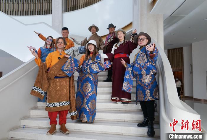 28日,参加“遇见幸福之城——2023外国人+大V带你逛西宁”活动的文旅达人走进青海藏文化博物院,体验藏族服饰穿搭,参观民族服饰展厅,感受安多地区、卫藏地区和康巴地区不同藏族服饰的文化魅力。图为文旅达人们展示精美的藏族服饰。中新网