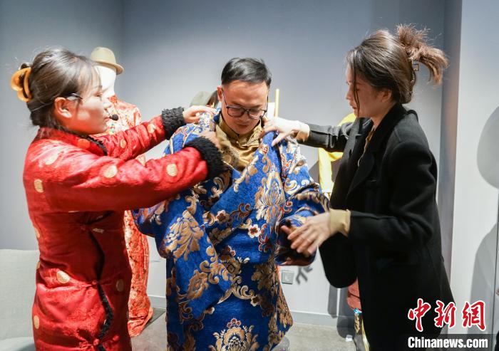 工作人员协助一位文旅达人穿搭藏服。中新网