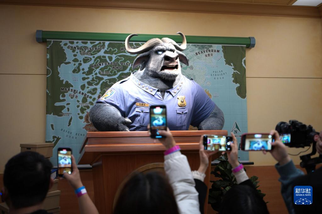 作为深受全球各年龄层观众喜爱的故事,《疯狂动物城》动画电影在2016年一经上映,即在中国引起广泛关注,迄今仍稳坐中国内地影史进口动画片的冠军宝座。图为上海迪士尼乐园“疯狂动物城”里的“警察局牛局长”吸引嘉宾。新华社