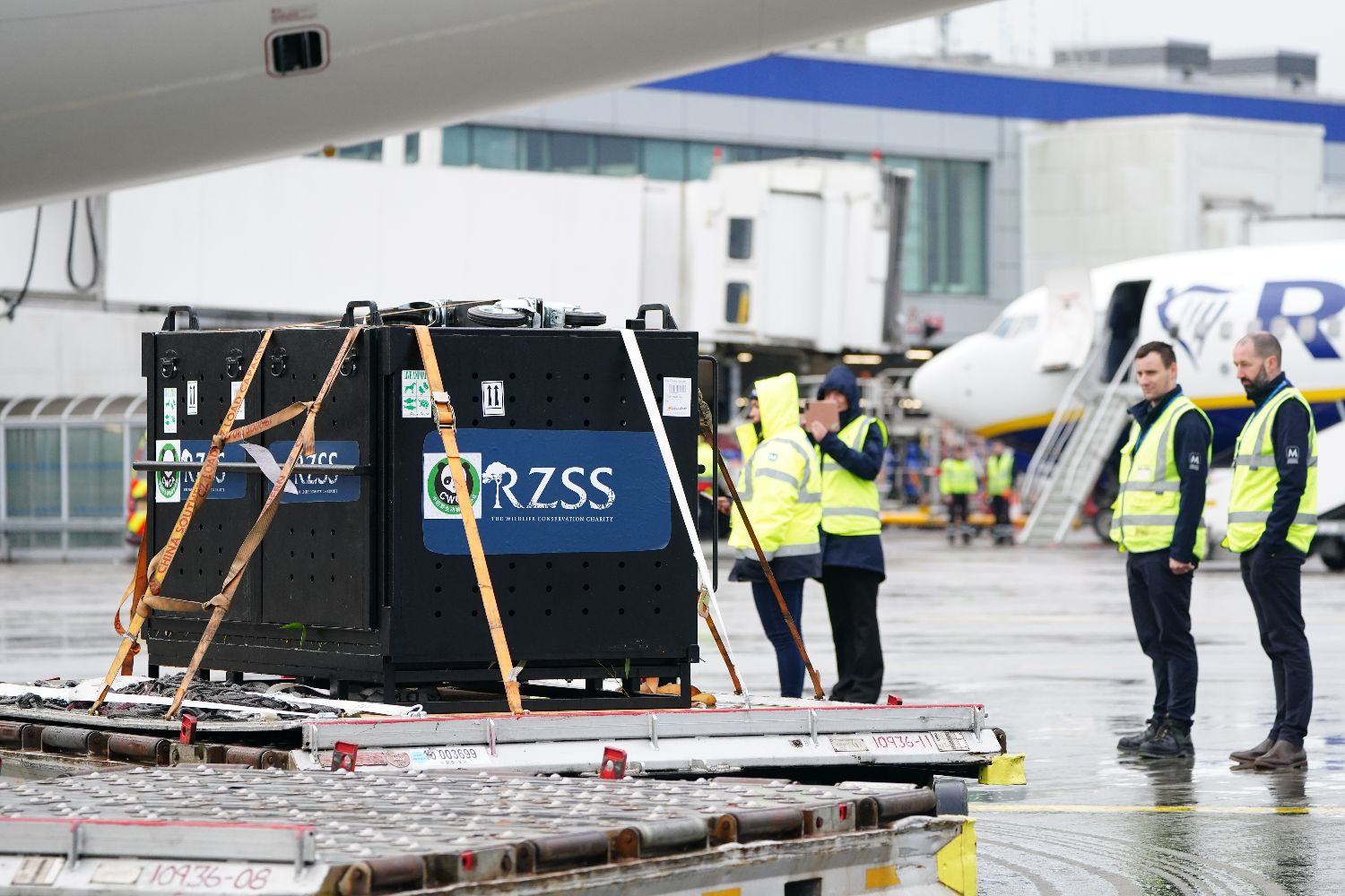 12月4日,在英国苏格兰爱丁堡机场,金属板条箱里的大熊猫“阳光”和“甜甜”被装上南航货运飞机,开始返回中国的旅程。视觉中国