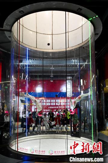 12月6日至8日,中国2023年全国室内跳伞(风洞)锦标赛,在重庆际华园体育小镇举办。来自中国各地的航空运动学校、协会、俱乐部的专业跳伞队员及部分业余爱好者齐聚于此,进行室内跳伞技艺角逐并展示风洞项目的潜力和魅力。图为选手在比赛中。中新网