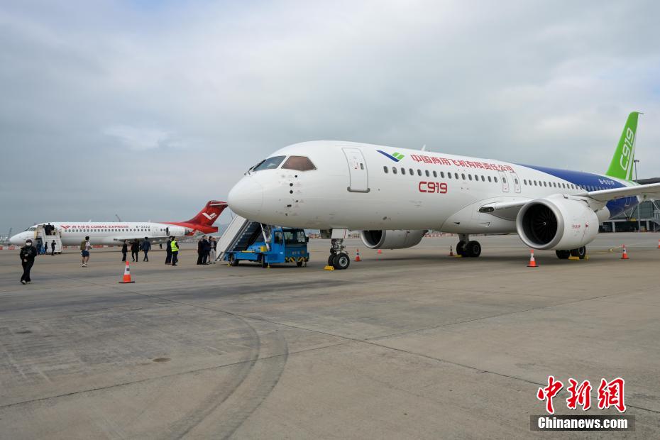 12月13日,香港特区政府民航处及机场管理局在香港国际机场停机坪为中国国产飞机C919和ARJ21举行欢迎仪式,并让传媒登机参观C919及ARJ21飞机。据悉,活动期间两款飞机将在香港国际机场进行静态展示,C919飞机更会于16日由香港国际机场起飞,然后由西至东进入并飞越维港上空,环绕香港岛翱翔两圈。届时市民可近距离一睹这架飞机的风采。图为中国国产飞机C919(前)和ARJ21(后)。中新网