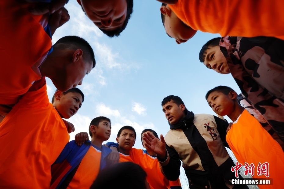 足球队教练玉山江·艾买提指导球员战术。中新网