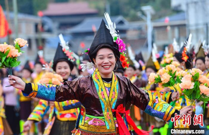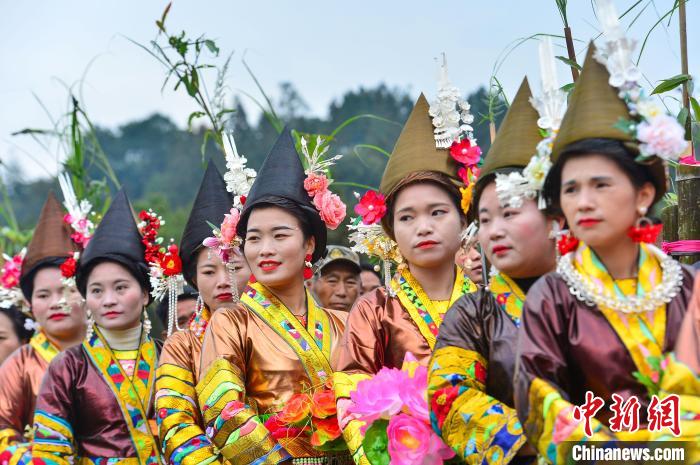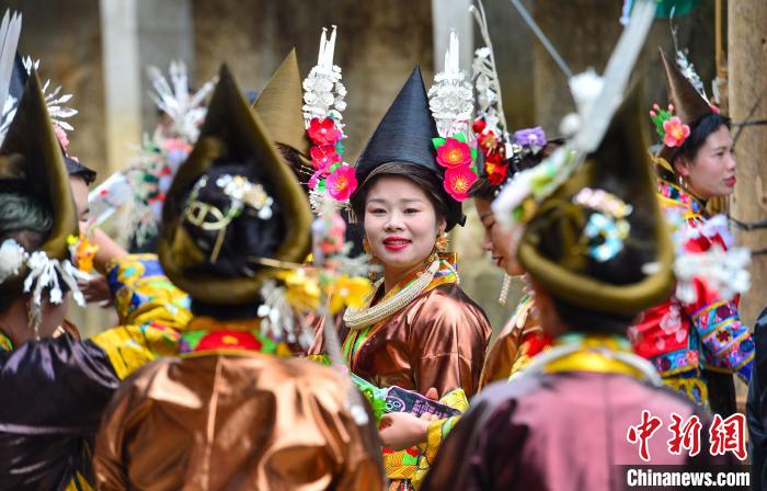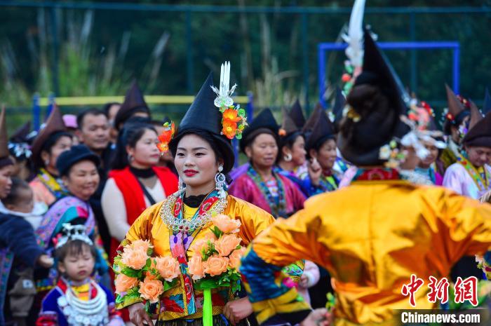 身着盛装的苗族村民在贵州省从江县斗里镇台里村参加一年一度的芦笙节活动。中新网