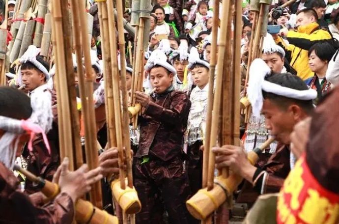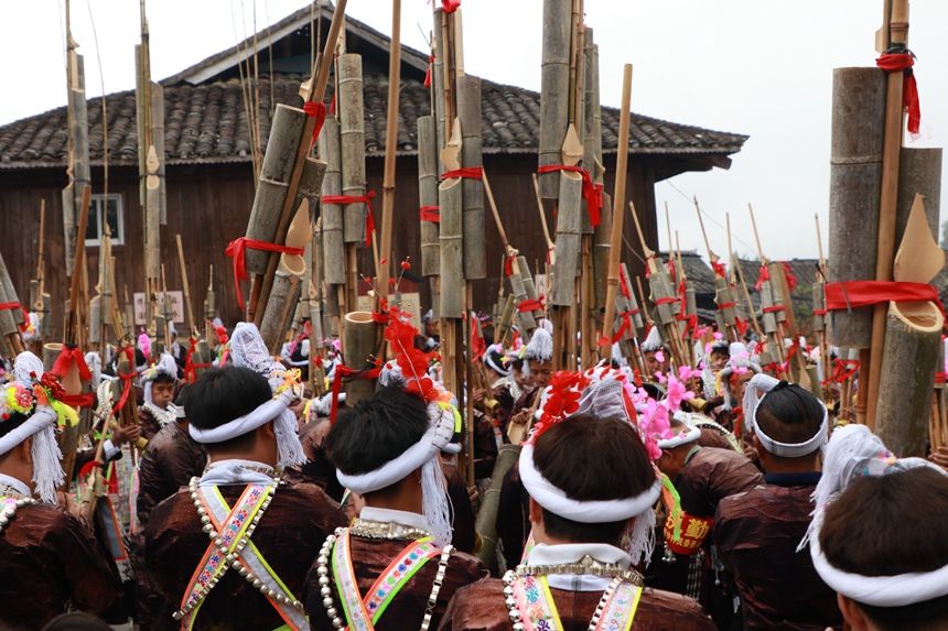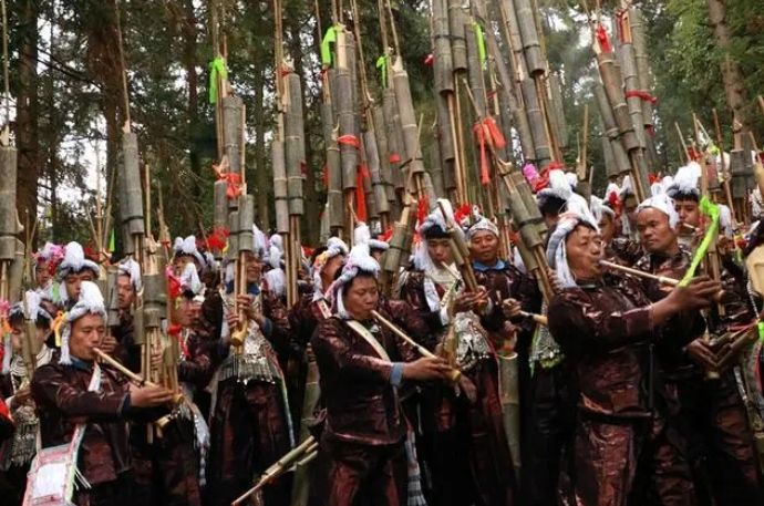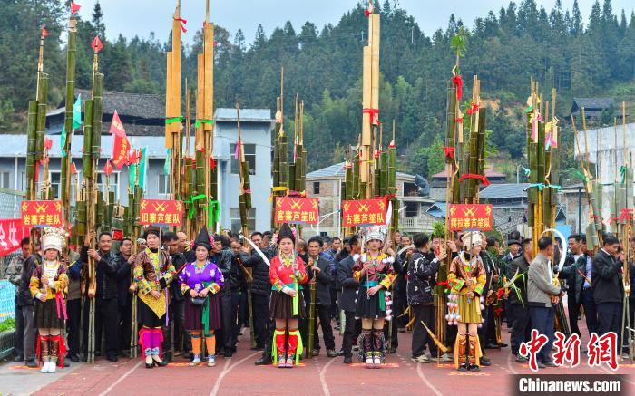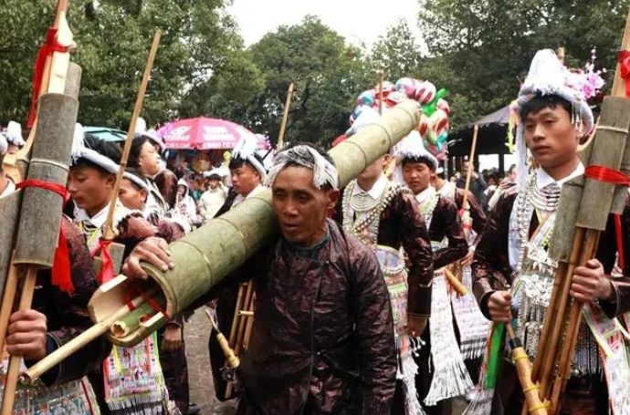 苗族村民扛着芦笙一同庆祝芦笙节。金台资讯