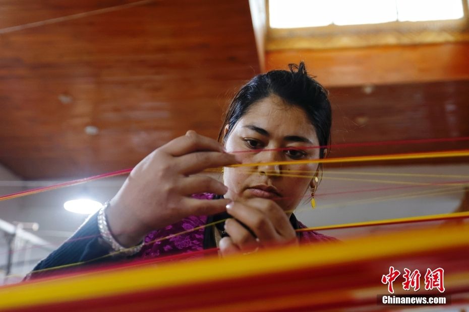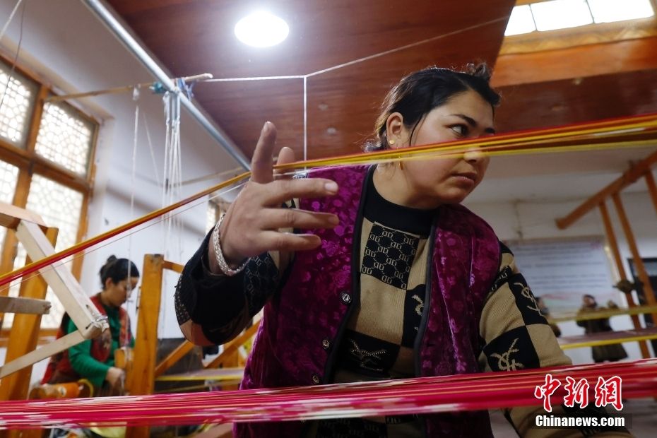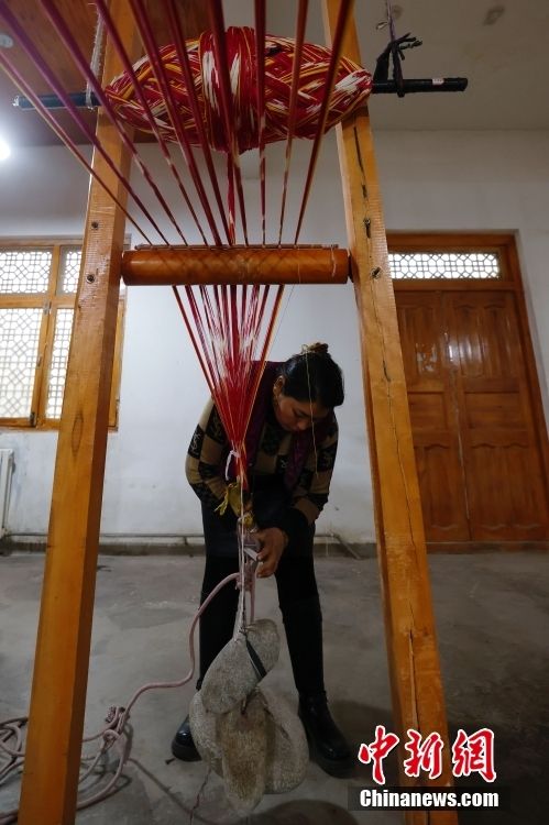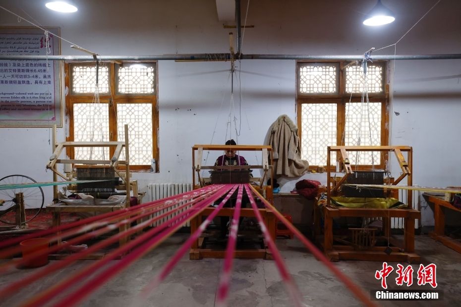 12月16日,新疆和田市吉亚乡,当地村民穆凯代斯·塞迪麦麦提用手梳理织出的艾德莱斯绸。据悉,艾德莱斯绸是新疆特色手工艺品。2008年,艾德莱斯绸织染技艺入选中国国家级非物质文化遗产名录。