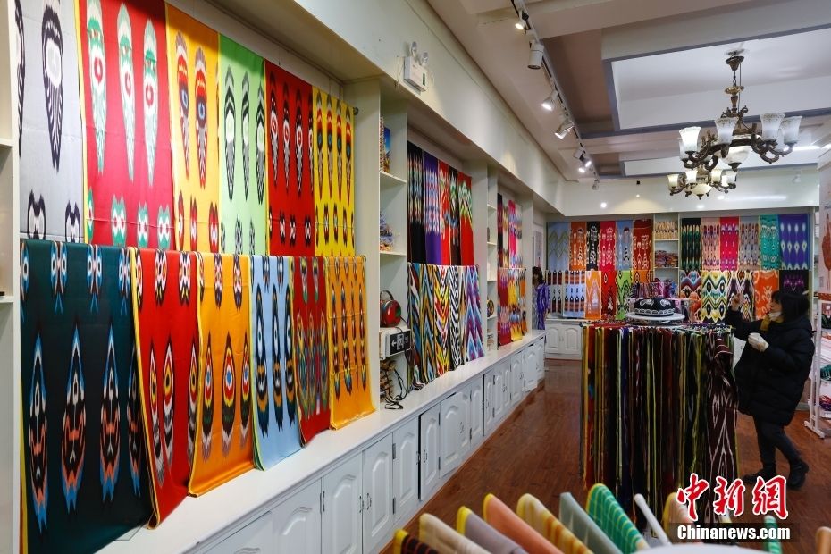 12月16日,位于新疆和田市吉亚乡的工坊艾德莱斯绸展示销售区。