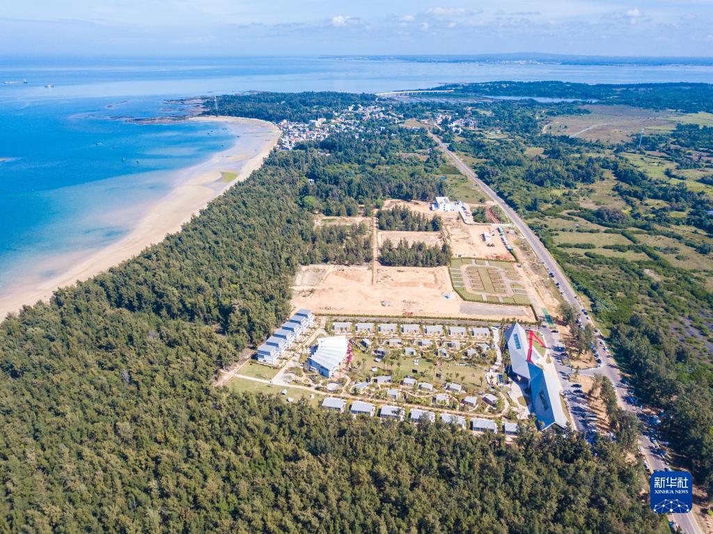在海南省儋州市拍摄的海南环岛旅游公路和“儋耳追光”驿站(无人机照片,12月15日摄)。新华社