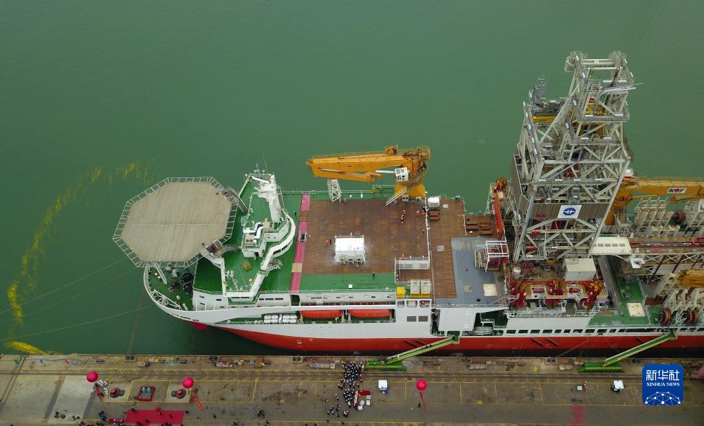 12月18日,中国自主设计建造的首艘大洋钻探船正式命名为“梦想”号,并在广州南沙首次试航。大洋钻探被誉为海洋科技“皇冠”。“梦想”号由自然资源部中国地质调查局与150余家单位密切协同建造,总吨约33000吨,续航力15000海里,自持力120天,具备全球海域无限航区作业和海域11000米钻探能力。图为12月18日在广州拍摄的命名仪式现场。新华社