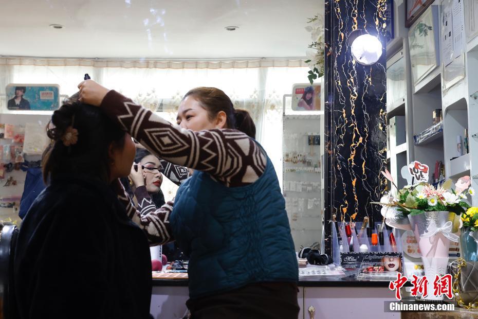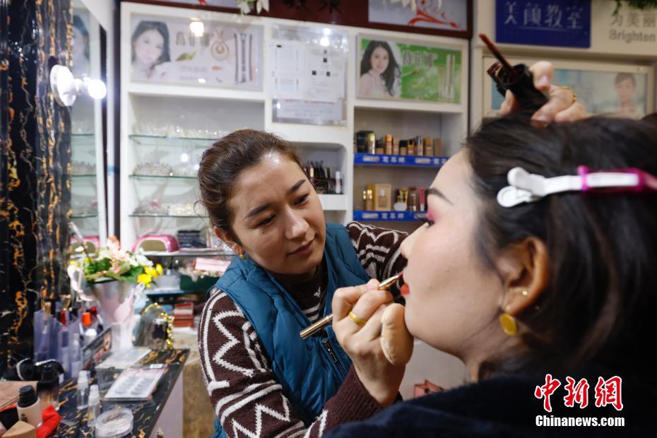 努尔比耶·阿卜杜巴柯正在给顾客化妆,2年前,她专门学习技术,从农民转型成为美容美发店老板。