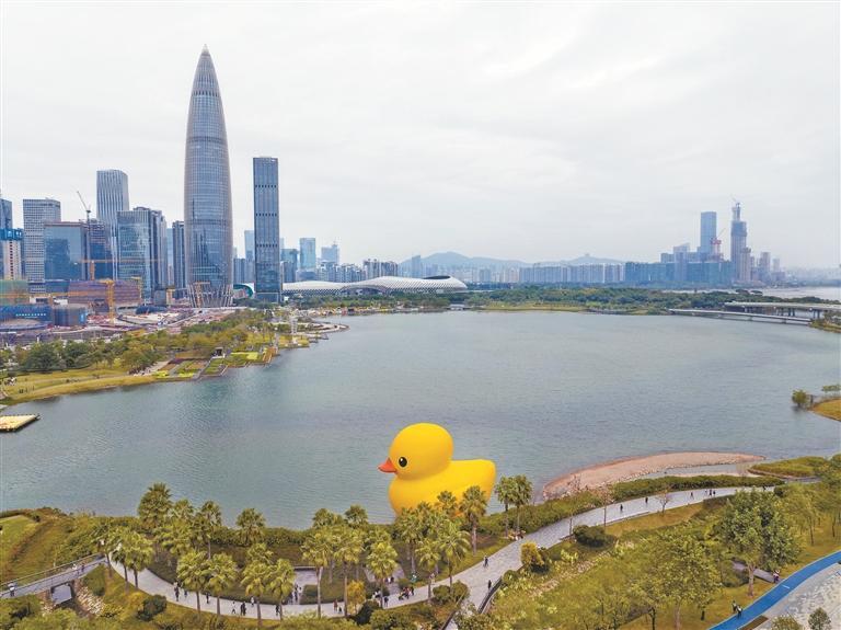 12月20日,荷兰国宝级艺术家弗洛伦泰因·霍夫曼带着他的代表作——18米高的巨型橡皮鸭,正式在深圳湾下水。与此同时,深圳湾公共艺术季启动,揭开岁末狂欢序幕。图为“大黄鸭”遨游深圳湾,引来市民打卡。 《深圳商报》