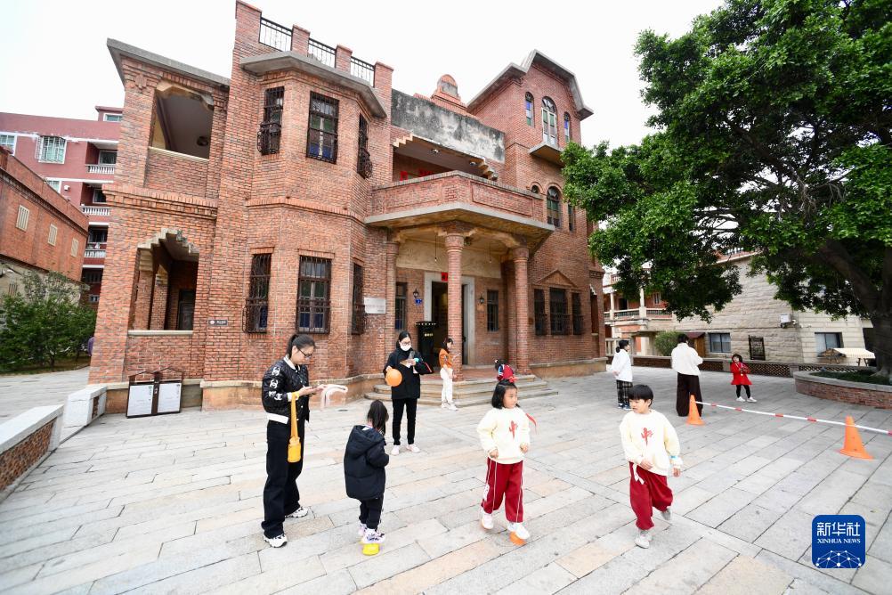 有“华侨建筑博物馆”美称的闽南传统村落——福建晋江梧林村有着600多年侨乡发展史。近年来,梧林村大力开展传统建筑修缮、基础设施提升和人居环境整治,成立乡村旅游运营公司,引入文创、非遗、演艺、研学等文旅业态,梧林村逐步发展成为乡村文化旅游目的地,游客数量逐年攀升,为侨乡注入新活力。图为12月19日,梧林村华侨历史建筑侨批馆前,小朋友参加学校组织的游乐活动。梧林侨批馆于1938年建成,是一幢哥特式建筑。新华社
