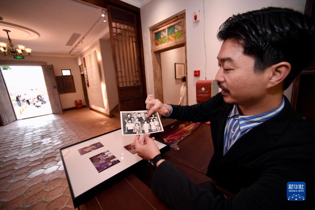 12月19日,梧林村侨批馆内,梧林艺术季策展人、归侨后代吴少鹏展示由菲律宾寄回的家族老照片。新华社