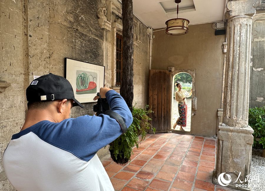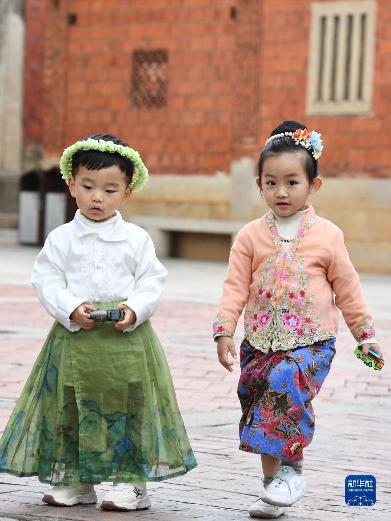12月10日,在梧林传统村落,不少游客身着“娘惹”服饰打卡。人民网