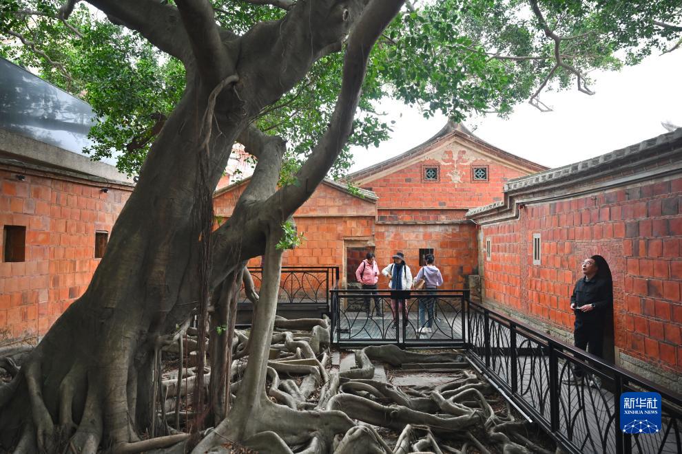 12月19日,游客在梧林村闽南古民居德卫宅内参观古榕树。新华社