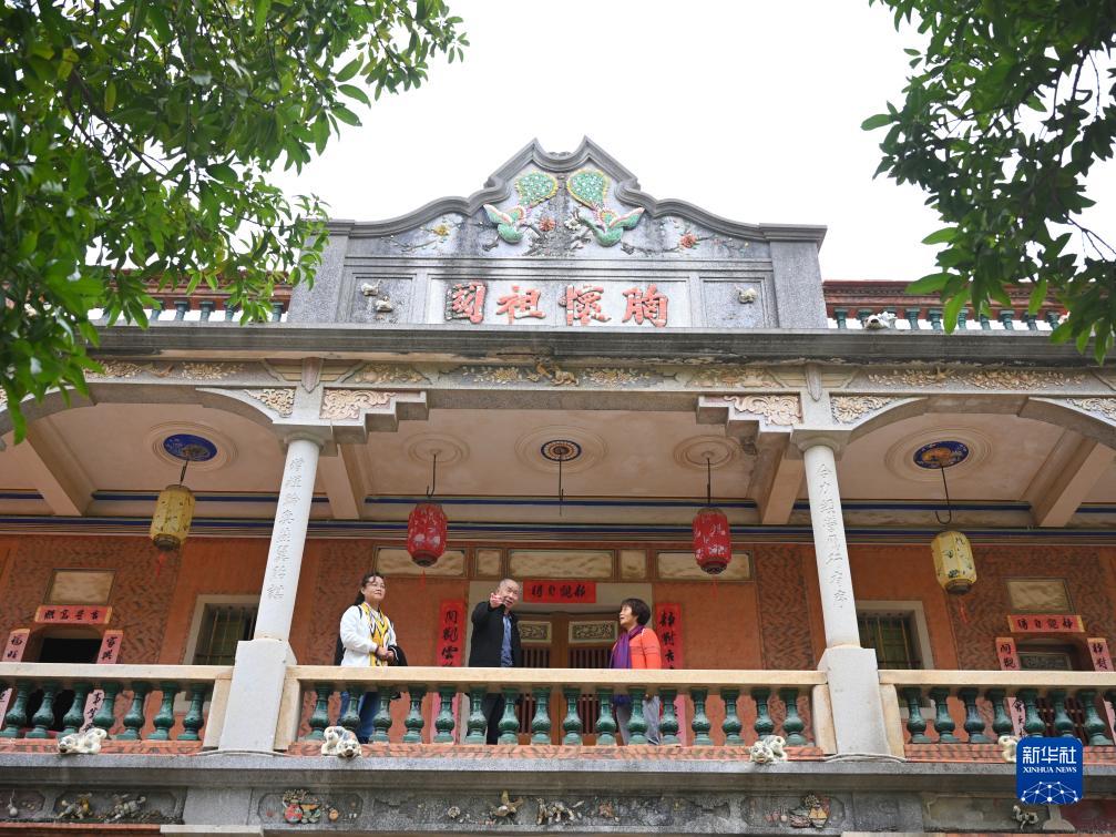 12月19日,梧林村华侨历史建筑“胸怀祖国楼”内,梧林村蔡文诗老人(中)为游客义务讲解。“胸怀祖国楼”建于1953年春,为旅菲华侨蔡怀紫、蔡怀番在家乡合建。新华社
