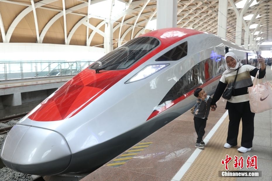 12月25日,在雅万高铁哈利姆车站,一对母子与列车合影。中新网