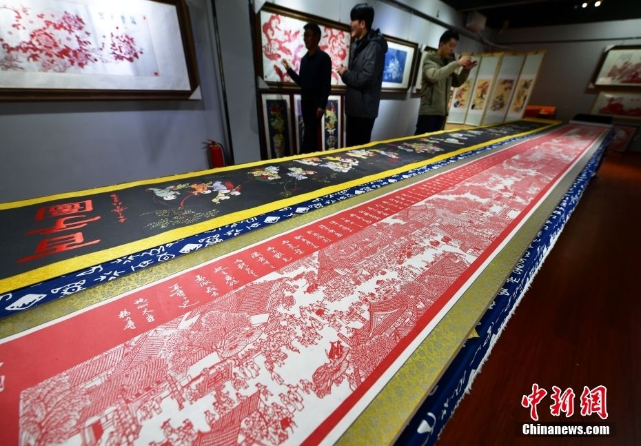 河北省阜城剪纸至今已有200多年历史,2016年被列入河北省省级非物质文化遗产名录。该技艺具有阴阳相间、线条流畅、色彩单纯、形象鲜明、刀工巧妙等艺术风格,它以传统的中国绘画为基础,材料有丝绸、布匹、绢纸、宣纸等。如今,阜城剪纸作品不仅畅销北京、天津、东北三省,还远销新加坡、韩国等28个国家和地区。图为12月28日,河北省衡水市阜城县一家剪纸工作室,参观者欣赏剪纸作品。中新网