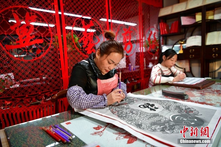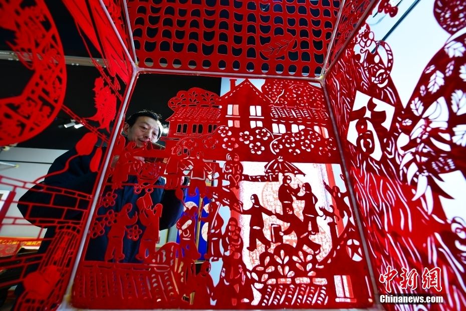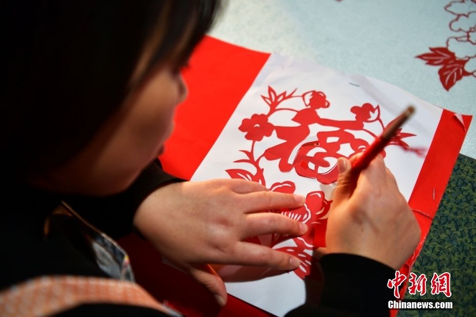 12月28日,河北省衡水市阜城县一家剪纸工作室,剪纸艺人制作剪纸作品。中新网