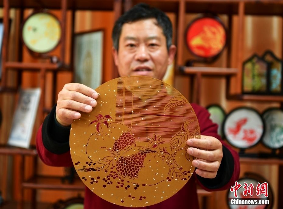 12月28日,河北省衡水市阜城县,剪纸艺人刘建国展示刚完成的剪纸作品。中新网