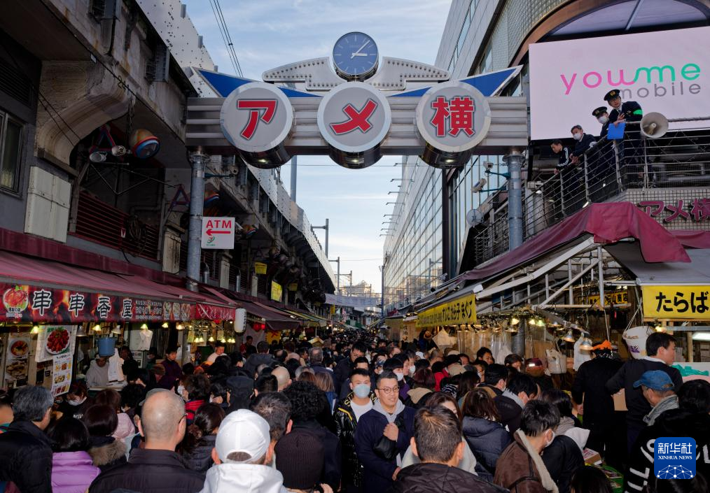 新年来临前,不少日本东京市民走上街头,在商店街购物,感受热闹新年气氛。图为2023年12月30日,人们在日本东京阿美横町商店街购物。新华社