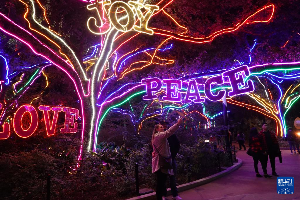 美国休斯敦动物园2023年11月17日至2024年1月7日举办灯光秀庆祝新年到来。图为12月30日,游客在美国休斯敦动物园的灯饰旁留影。新华社