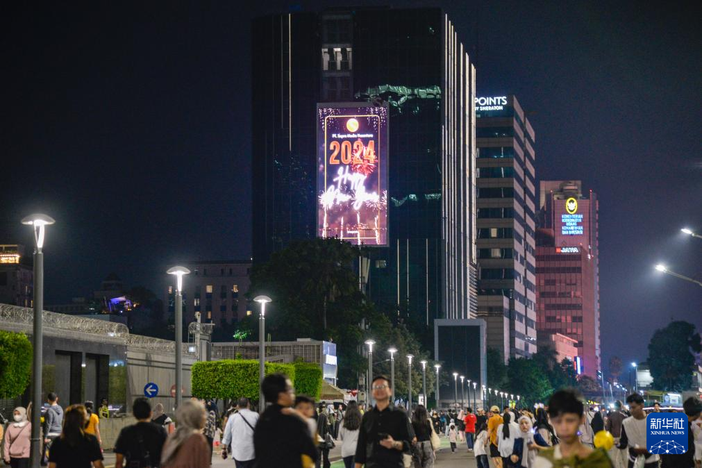 2023年12月31日晚在印度尼西亚雅加达拍摄的一块显示有“2024新年快乐”字样的广告屏。新华社