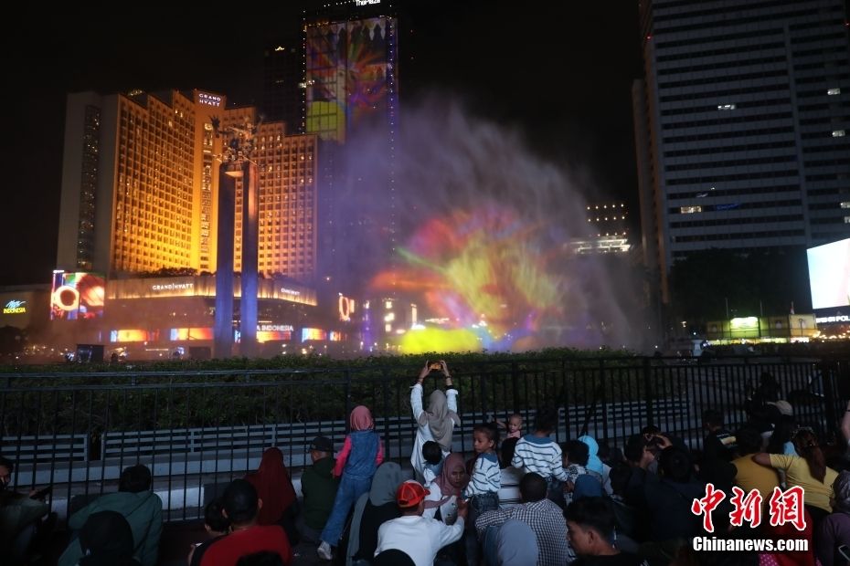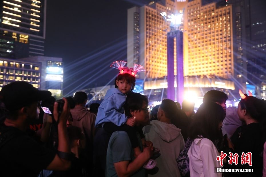 2023年12月31日晚,印度尼西亚首都雅加达,民众聚集在当地建筑地标、雅加达HI环岛前,迎接2024新年的到来。中新网
