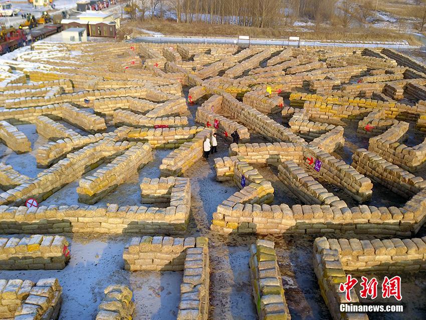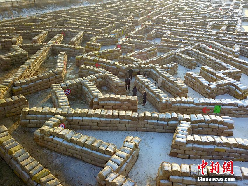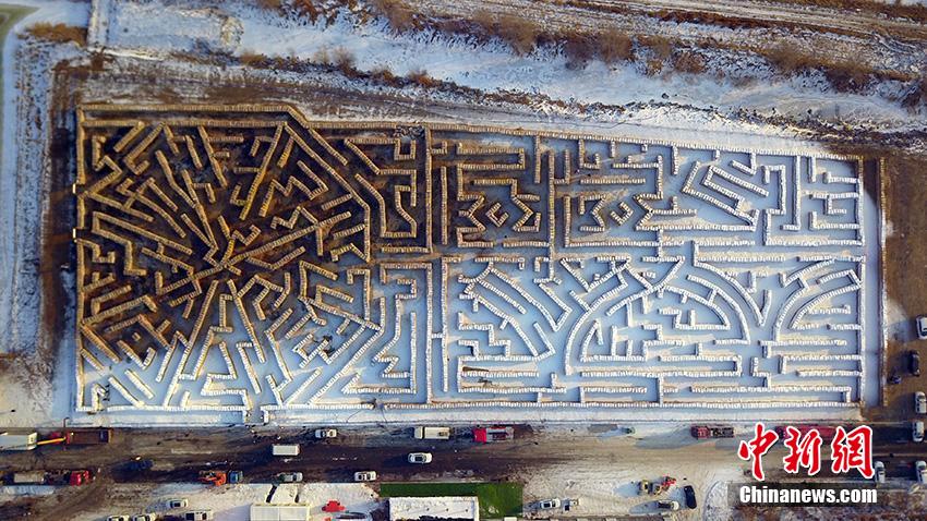 2023年12月29日,占地面积10035.1平方米的秸秆迷宫亮相吉林省农安县,经吉尼斯世界纪录认证官现场认证,这一数字成功打破了“最大的非永久性秸秆迷宫”吉尼斯世界纪录。图为空中俯瞰迷宫全貌。