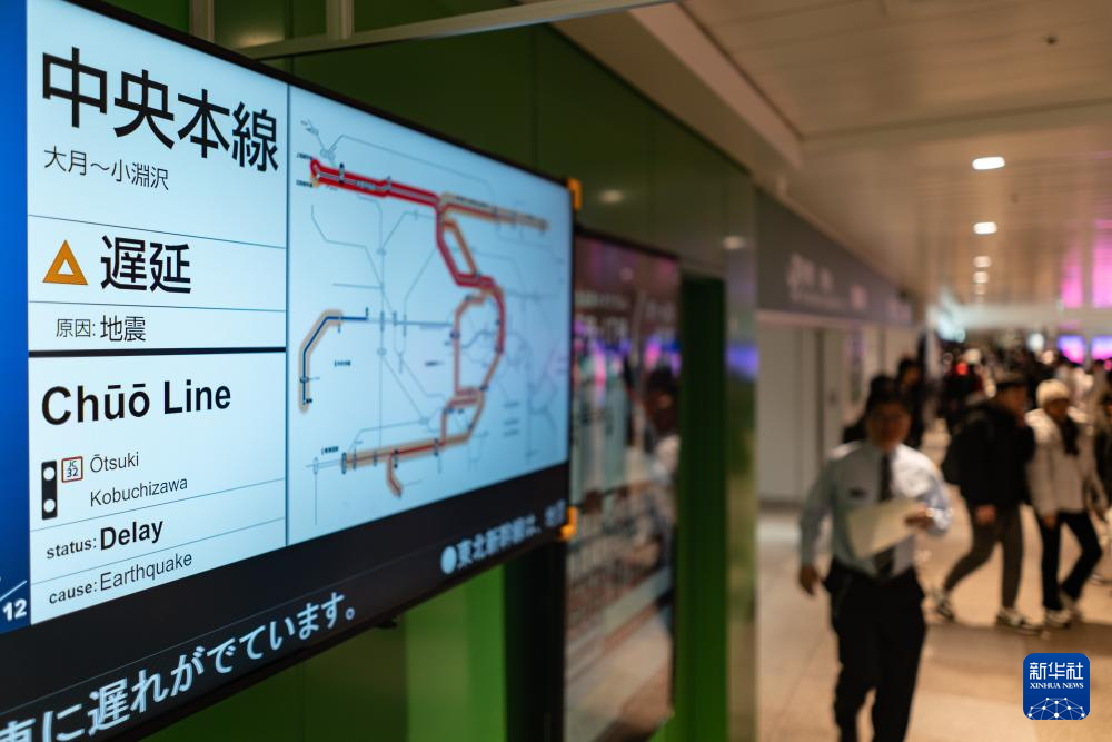 1月1日,在日本东京新宿车站,列车运营时刻表显示列车因地震延误。新华社