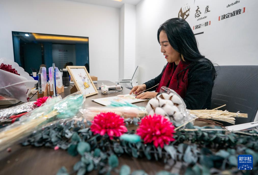 杨巧艳在工作室内制作鲜花花艺摆件(12月26日摄)。新华社