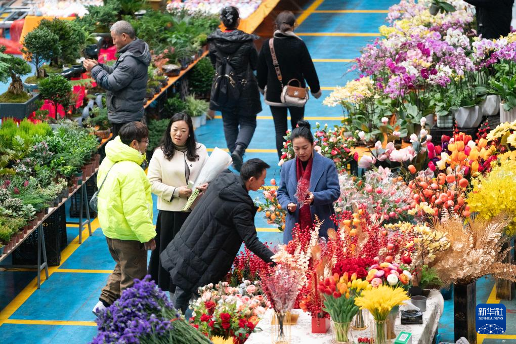 杨巧艳(右一)在斗南花卉市场挑选制作花艺作品的花材(12月26日摄)。新华社