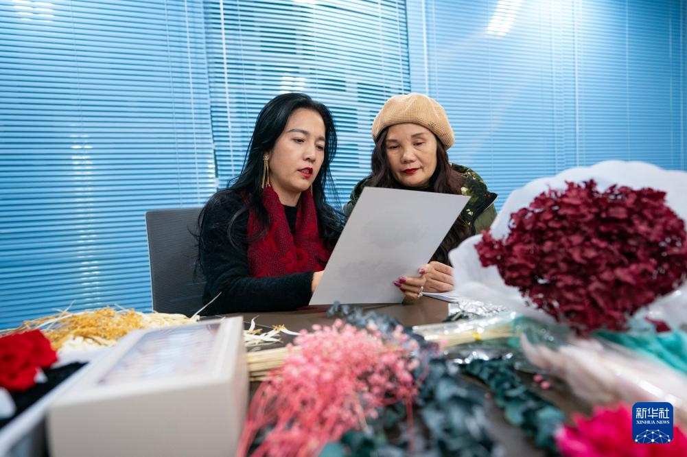 杨巧艳(左)和好友在斗南花卉市场的工作室内讨论花艺创作(12月26日摄)。新华社