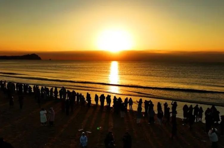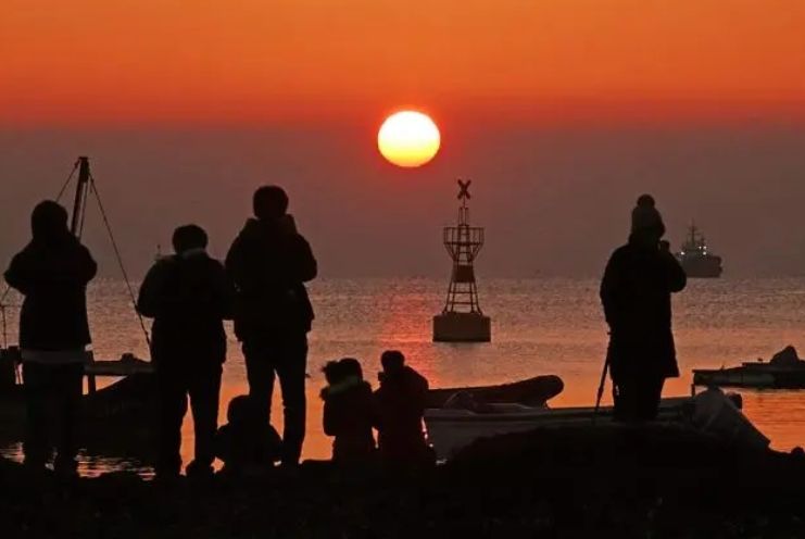 1月1日,山东省青岛市崂山区石老人海边,游客观看海上日出。中国日报网