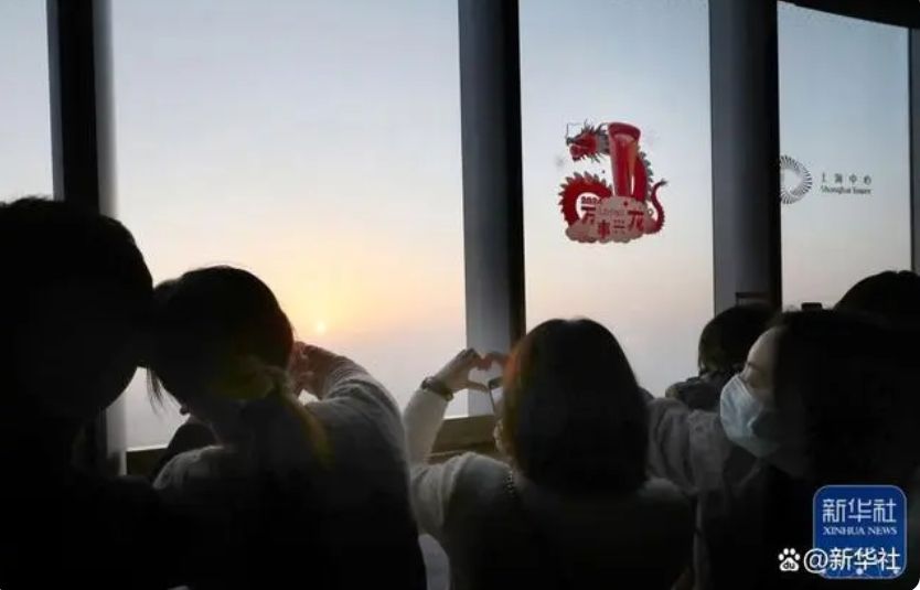 1月1日,市民游客在上海中心大厦顶楼观光厅看日出。新华社
