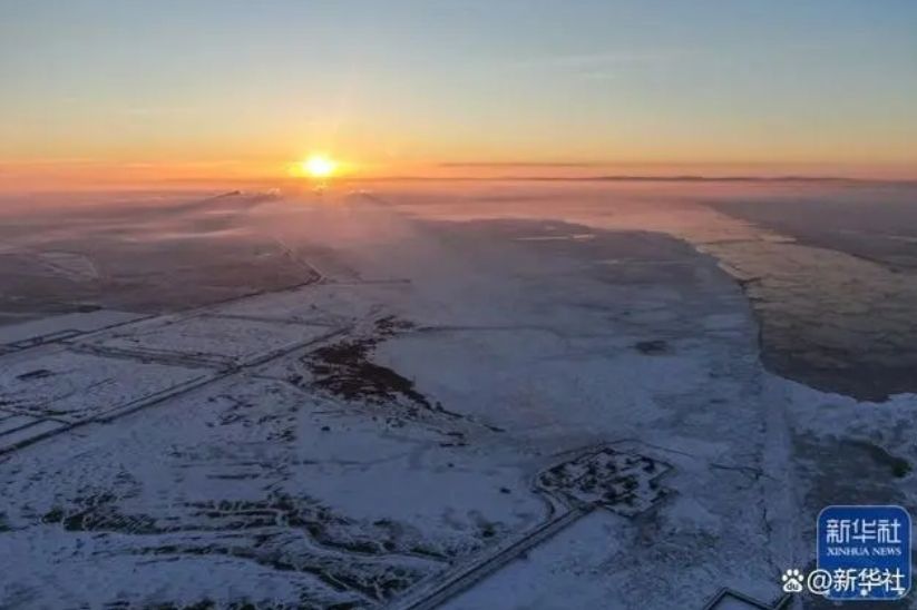 1月1日,在辽宁省盘锦市中国石油辽河油田拍摄的日出(无人机照片)。新华社