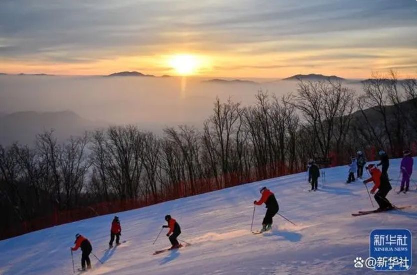 1月1日,在吉林省吉林市万科松花湖度假区,滑雪爱好者在晨光下滑雪。新华社