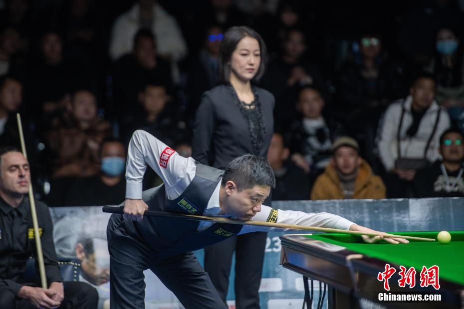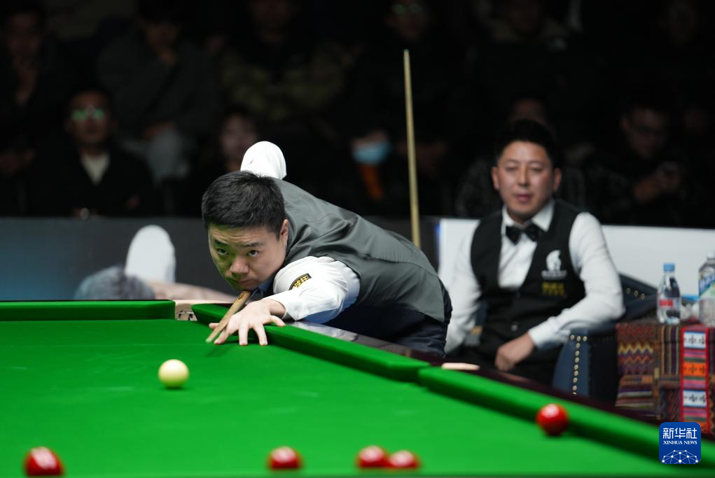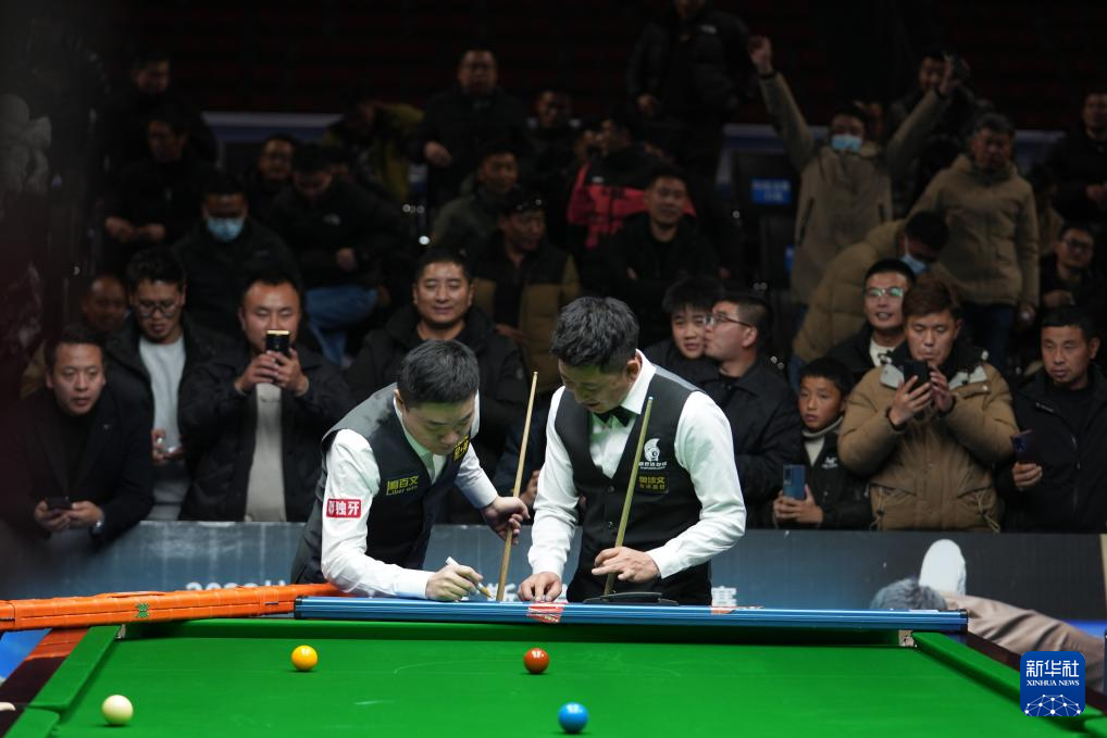 2023年12月31日,丁俊晖(左)与伍金多吉在比赛中。新华社