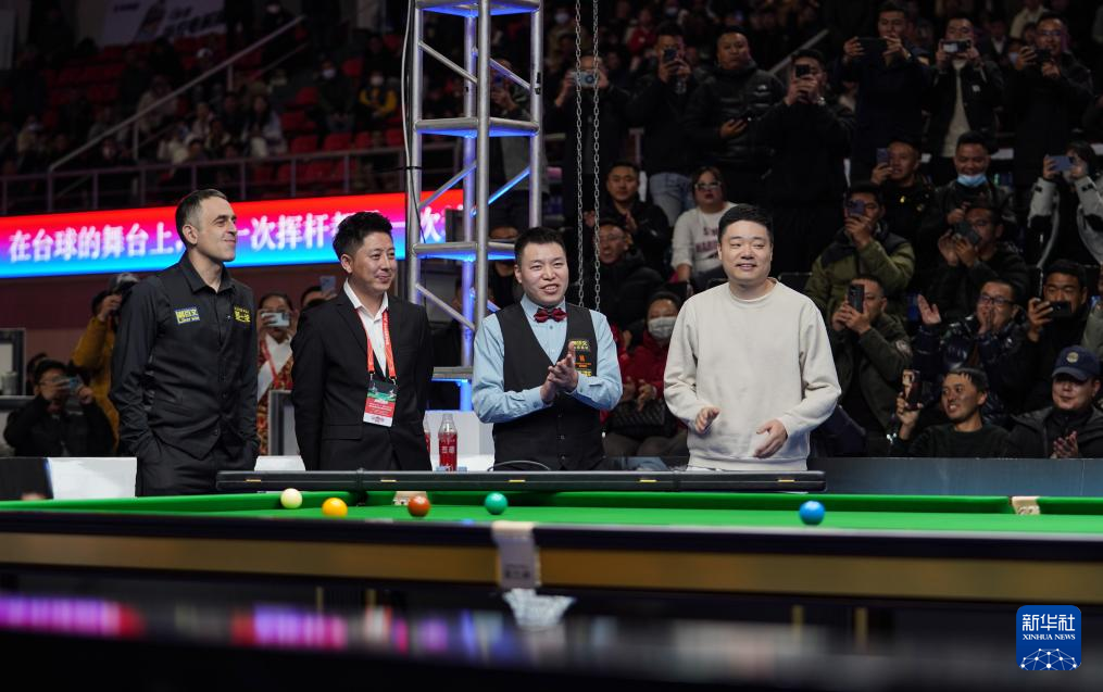 2023年12月31日,罗尼·奥沙利文、伍金多吉、耿渊和丁俊晖(从左至右)在赛前和观众互动。新华社