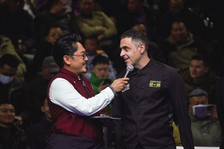 奥沙利文在“巅峰对决”比赛现场接受采访。中国西藏新闻网