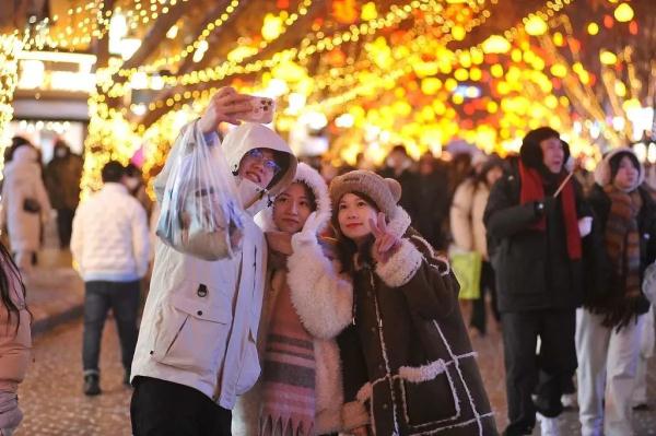 2023年12月31日晚,哈尔滨,游客们在中央大街,赏花灯,观看欧式建筑,打卡网红景点。黑龙江“极光新闻”公众号