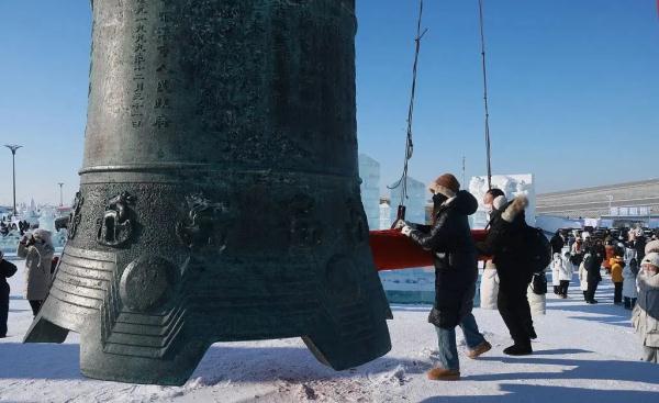 2023年12月31日,元旦假期,哈尔滨冰雪大世界里,游客挂祈福带、撞幸运钟,在新的一年祈福。黑龙江“极光新闻”公众号